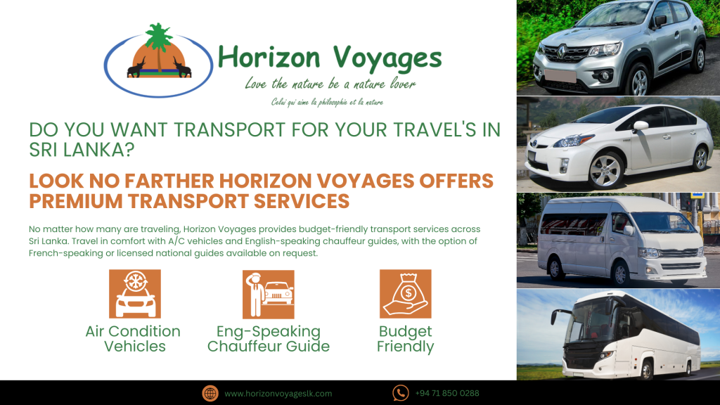 With Horizon Voyages, your transport is more than just a transfer it’s a key part of your Sri Lankan experience. Whether you’re traveling across the island or exploring hidden corners off the main routes, our vehicles and chauffeurs ensure that your journey is comfortable, flexible, and memorable.