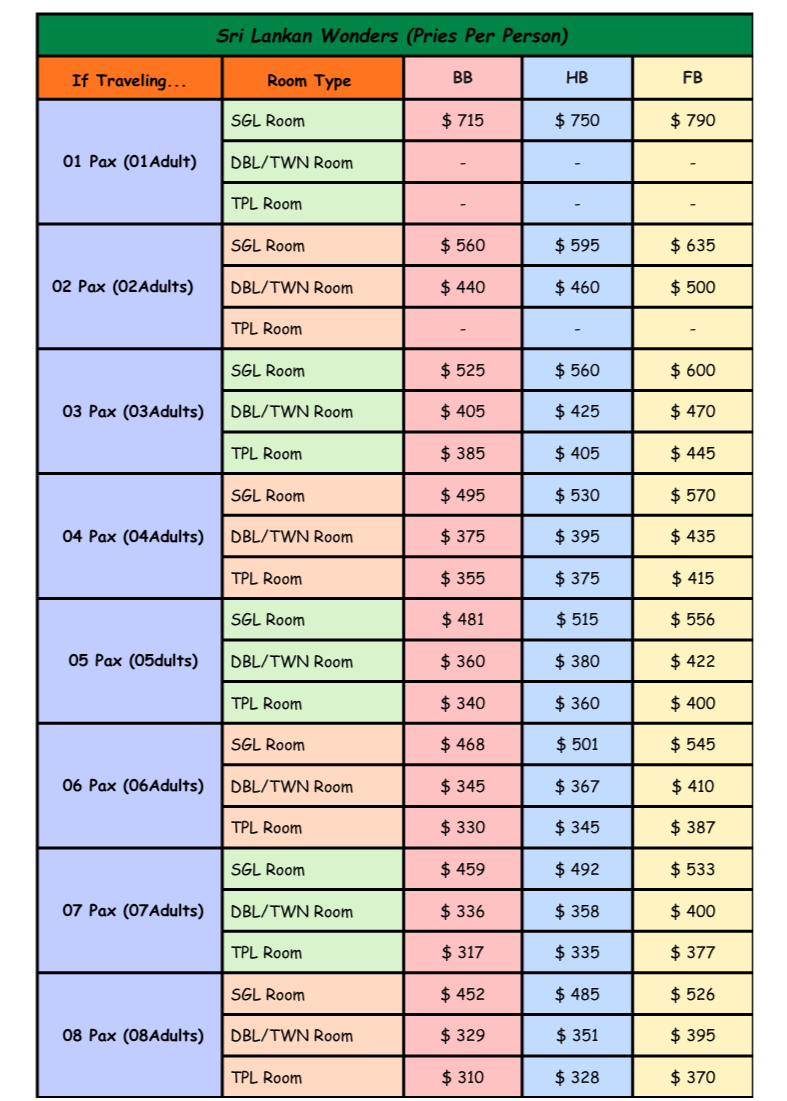 • The above prices does not include special season supplements such as Kandy Perahera/Christmas Eve/New Year Celebration.